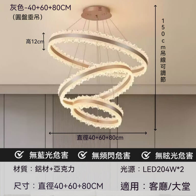 燈光顏色: 40cm單圈,60cm單圈,80cm單圈,40+60cm雙圈,50+80cm雙圈,60+80cm雙圈,40+60+80cm三圈平吊,40+60+80cm三圈,20+40+60+80+100伍圈